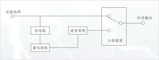 EPS应急电源专为消防设备和一级负荷用电设备而设计,其原理如下图所示,在交流电网正常时,由交流电网经过互投装置给重要负载供电,当交流电网断电后,互投装置将立即投切至逆变电源供电,当电网电压恢复时,应急电源将恢复为电网供电。基本原理图如下: